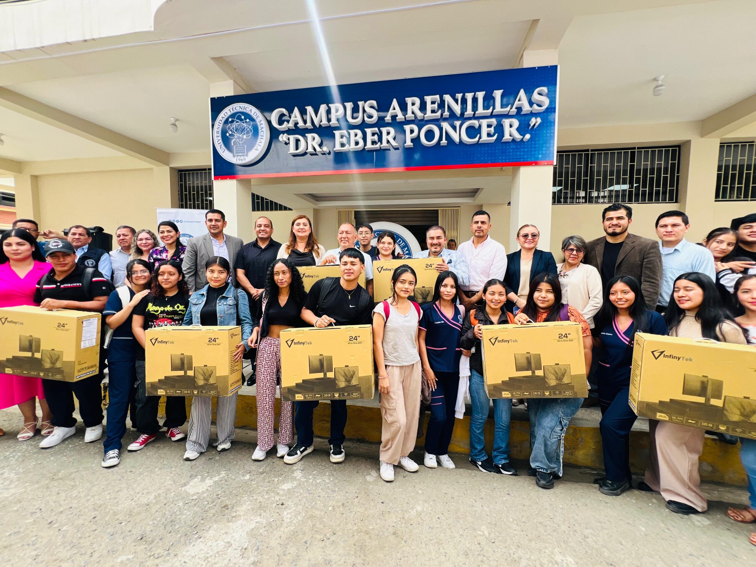 Arenillas.- La Universidad Técnica de Machala (UTMACH) recibió un lote de 40 computadoras y 5 pantallas interactivas por parte de la Prefectura de El Oro, como parte del cumplimiento del convenio tripartito suscrito entre esa entidad provincial, la Municipalidad de Arenillas y la UTMACH. Este convenio permite el funcionamiento del campus universitario en el cantón Arenillas y busca fortalecer la educación superior en la región.La entrega de estos equipos informáticos es un paso importante para mejorar la calidad de la educación en el campus Arenillas, que actualmente cuenta con aproximadamente 300 estudiantes matriculados en las carreras de Derecho, Educación Inicial, Psicología Clínica, Educación Básica, Finanzas y Negocios Digitales. Estos estudiantes se beneficiarán directamente de la modernización de la infraestructura tecnológica del campus.